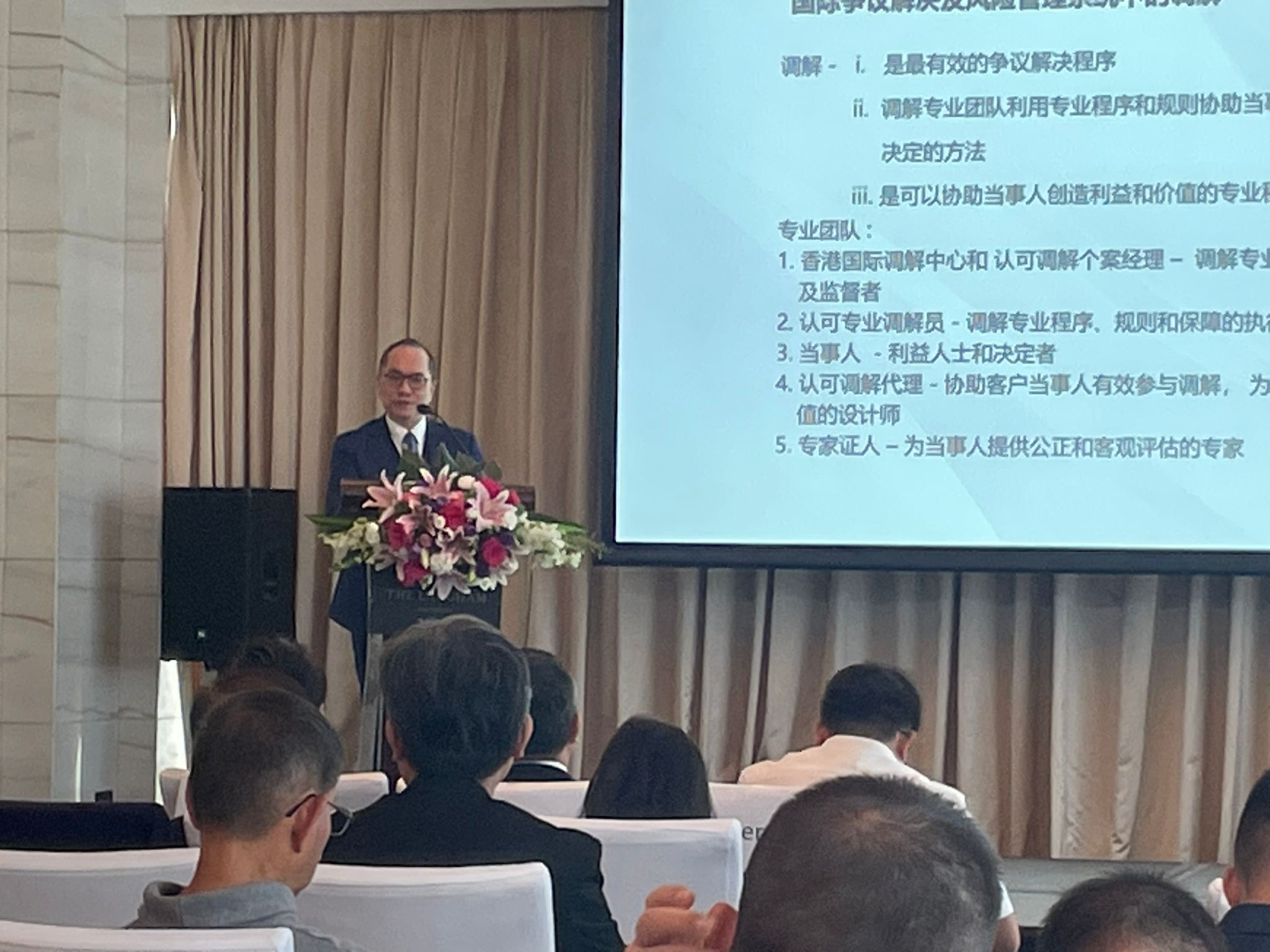 秉持推广跨境调解,由国际争议解决及风险管理协会主办、香港特别行政区政府工业贸易署「工商机构支持基金」资助及高峰进修学院所执行「夸境调解如何帮助中小企业解决员工赔偿、内部冲突和其他纠纷」的专题讲座十月十四日于深圳东海朗廷酒店成功举办。国际争议解决及风险管理协会主席罗伟雄、广东宝慧律师事务所专职律师林海红和企业常年法律顾问尹莉莉律师分别为港企介绍了解决国际纠纷和雇员赔偿的经验。